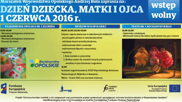 Marszałek województwa opolskiego Andrzej Buła zaprasza dzieci z rodzicami lub opiekunami do Bierkowic, teatru i filharmonii. W Muzeum Wsi Opolskiej od godziny 10.00 pokazy i warsztaty w zabytkowych obiektach, a od 13.00 atrakcją będą na pewno przejażdżki konne dla najmłodszych zorganizowane przez Ludowy Klub Jeździecki Ostroga. W Teatrze im. Jana Kochanowskiego od 11.00 rodzinna dyskoteka z atrakcjami, a także kącik z grami i zabawami dla najmłodszych.