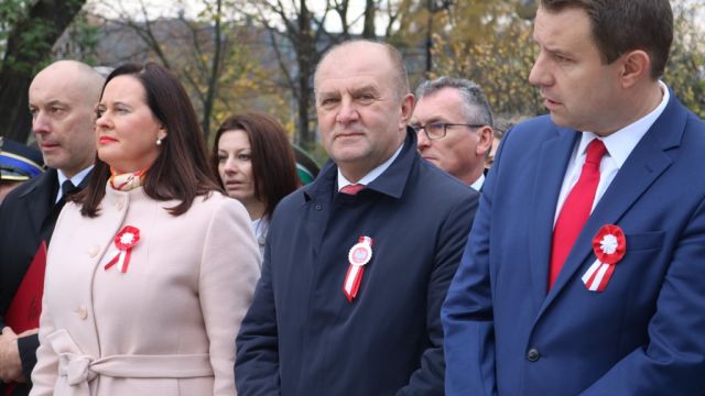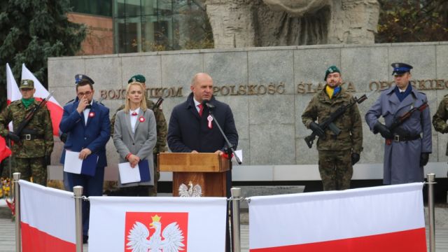 – Ci którzy walczyli o niepodległość Polski, musieli schować ambicje polityczne, wytyczyć wspólne cele, aby dać nadzieję i wiarę ludziom, że dokonują się wielkie rzeczy – mówił w swoim przemówieniu marszałek województwa Andrzej Buła. Jak dodał, jesteśmy świadkami tego stulecia i tego co wydarzyło się 5,10, 30 czy 50 lat temu. Te doświadczenia były różne, II wojna światowa, reżim komunistyczny. Jednak to wszystko łączyła niezłomność i nadzieja, która dawała siłę. Nadzieja, która czasem się jedynie tliła, była pielęgnowana i uwalniała energię, gdy ta była potrzebna. Zdaniem marszałka, Święto Niepodległości ma trzy wymiary dla każdego z nas. – Wczoraj, to jest to, co minęło i nie mamy to wpływu, ale mamy szczery obowiązek pamiętać o tych, którzy ponieśli ofiarę za wolną i niepodległą Polskę. Wczoraj, to także nasze rodzinne wspomnienia i aktywność przez lata. Dzisiaj, to obecność na uroczystościach, uśmiechy, reakcje, emocje, które każdy może odczuwać indywidualnie i świętować na swój sposób. Jutro natomiast, to wielkie zobowiązanie, praca zawodowa, obowiązki, ale także wymiar osobisty – marzenia, plany, rodzina. Niepodległość i wolność trzeba mieć w sercu, głowie, duszy. Wtedy to poczucie osobistej wolności i niepodległości przełoży się na to, że nasz kraj będzie się czuł wolnym. Światło wolności potrzebuje naszej energii, demokracja zaangażowania i odwagi, a patriotyzm nie ma urlopu – dodał Andrzej Buła.