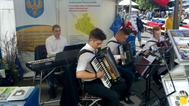 Niewątpliwie największą atrakcją na naszym stoisku było trio akordeonowe PeeRPe w składzie Rafał Wiench, Piotr Matyszok oraz Patryk Filipp. Muzycy, działający przy Łubniańskim Ośrodku Kultury, przez dwa dni targów zadbali o wspaniałą oprawę muzyczną. Akordeonistów podczas koncertu wspomagał na keyboardzie założyciel grupy oraz nauczyciel muzyki Artur Kansy-Budzicz. Pan Kansy-Budzicz, który na co dzień piastuje stanowisko zastępcy wójta Popielowa, przygotował dla licznych gości także zestaw materiałów informacyjnych o swojej miejscowości oraz gminie Łubniany. Na targach obecny był również starosta powiatu brzeskiego Jacek Monkiewicz, który nie tylko reprezentował całą delegację opolską, ale wspólnie ze wszystkimi wystawcami przez oba dni targów był do dyspozycji naszych gości, odpowiadając na ich pytania oraz zachwalając im walory, jak i atrakcje turystyczne naszego województwa, a przede wszystkim powiatu brzeskiego.