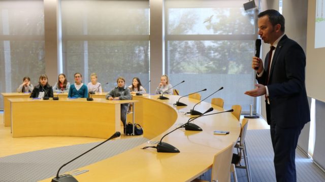 Przewodniczący Sejmiku Województwa Opolskiego Rafał Bartek, witając się z uczniami, przekazał garść informacji na temat swojej pracy, odpowiedzialności za decyzję i powagi sejmiku województwa.