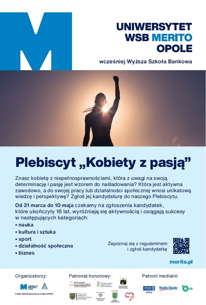 Uniwersytet WSB Merito Opole we współpracy z Państwowym Funduszem Rehabilitacji Osób Niepełnosprawnych organizują Plebiscyt „KOBIETY Z PASJĄ”.