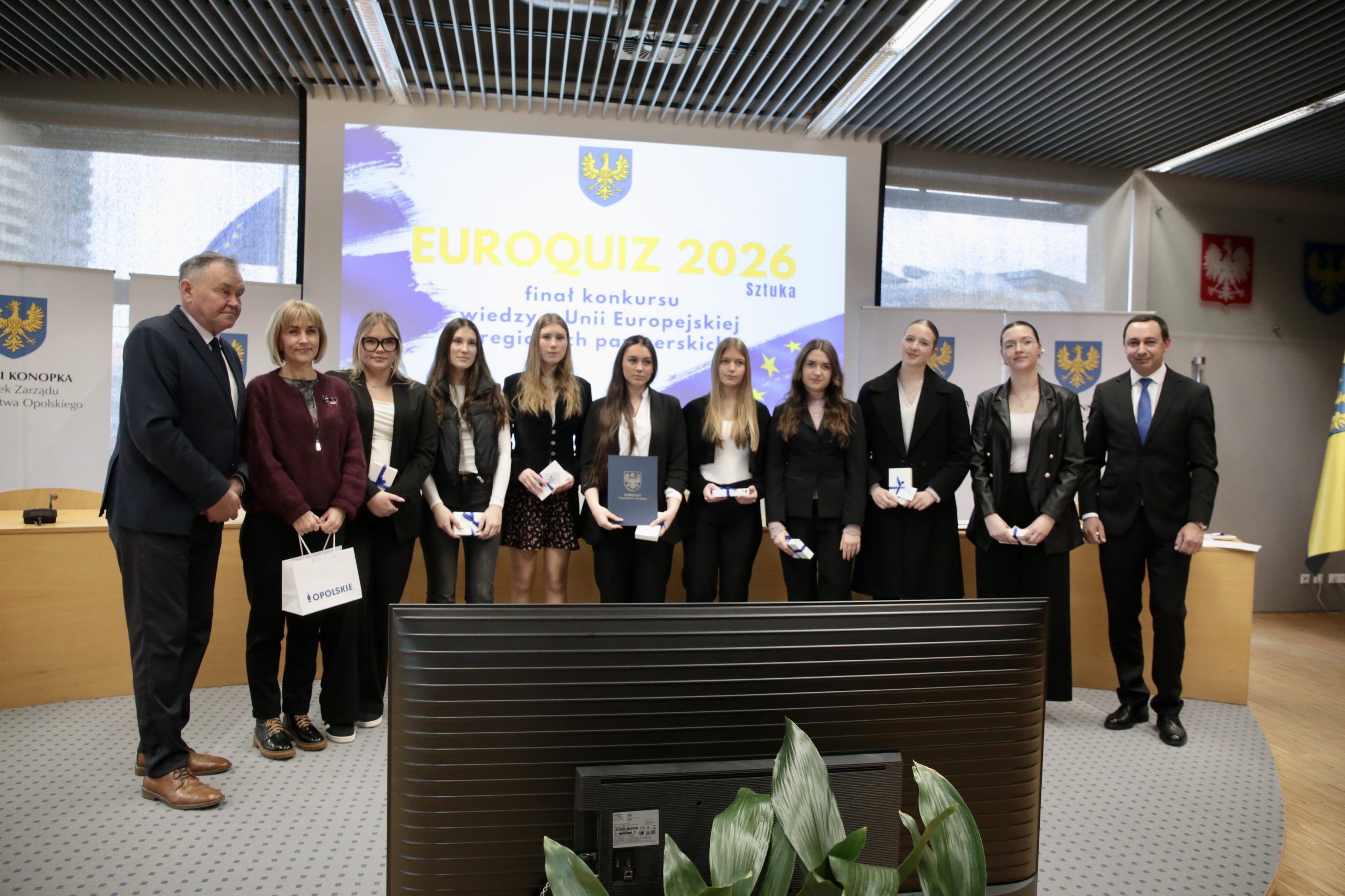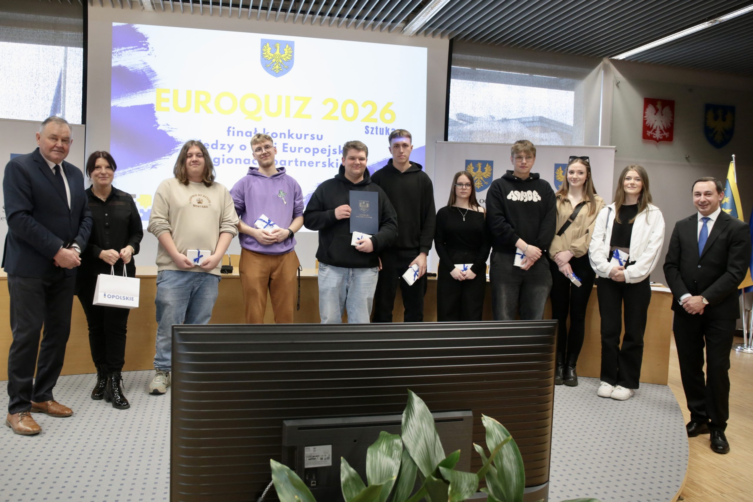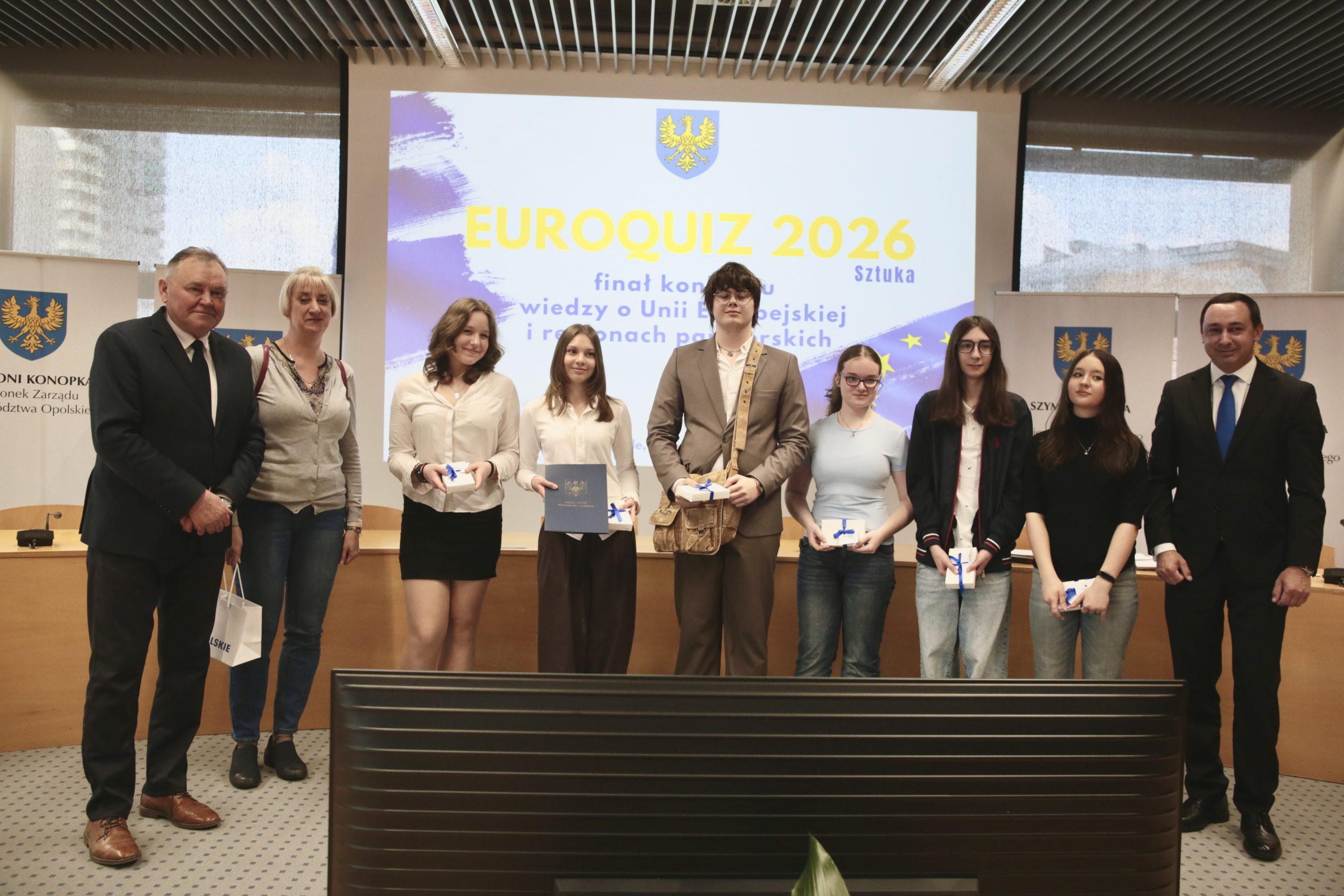 EUROQUIZ to konkurs wiedzy o Unii Europejskiej i regionach partnerskich województwa opolskiego, skierowany do uczniów szkół ponadpodstawowych. Uczestnicy, pracując w kilkuosobowych zespołach, odpowiadali na 20 pytań testowych związanych z aktualnym tematem. W tym roku była nim sztuka (sztuki piękne, film, literatura, muzyka itp.). Przykładowo, jedno z pytań dotyczyło tego, jaki ser pojawia się w filmie „Vingt Dieux” kręconym w regionie Burgundia–Franche-Comté, a inne sprawdzało wiedzę o festiwalach odbywających się w tym regionie. Pojawiły się też pytania o znanych pisarzy, europejskie nagrody filmowe czy wydarzenia kulturalne w województwie opolskim. Jak wygląda proces konkursu tłumaczyła Joanna Kisielewska z Departamentu Edukacji i Rynku Pracy UMWO – Testy ze szkół są do nas przysyłane, następnie komisja je ocenia i wyłaniane są drużyny, które dostały maksymalną ilość punktów. W tym roku tych zespołów mamy bardzo dużo, bo aż 19. Najlepsi spotkali się dziś na dogrywce w Urzędzie Marszałkowskim Województwa Opolskiego, gdzie walczyli o główną nagrodę, czyli wyjątkowy wyjazd do Brukseli w dniach 1-3 czerwca tego roku. Dogrywka polegała na rozwiązaniu przez każdego z członków drużyn 10-pytaniowego testu, dotyczącego tematyki tegorocznej edycji oraz wiedzy o funkcjonowaniu UE i regionów partnerskich – wyjaśniła.
